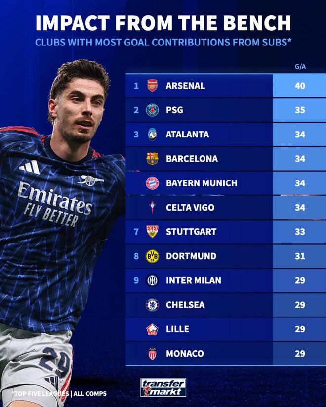 五大联赛球队替补参与进球榜:阿森纳40球第1,巴黎35球第2